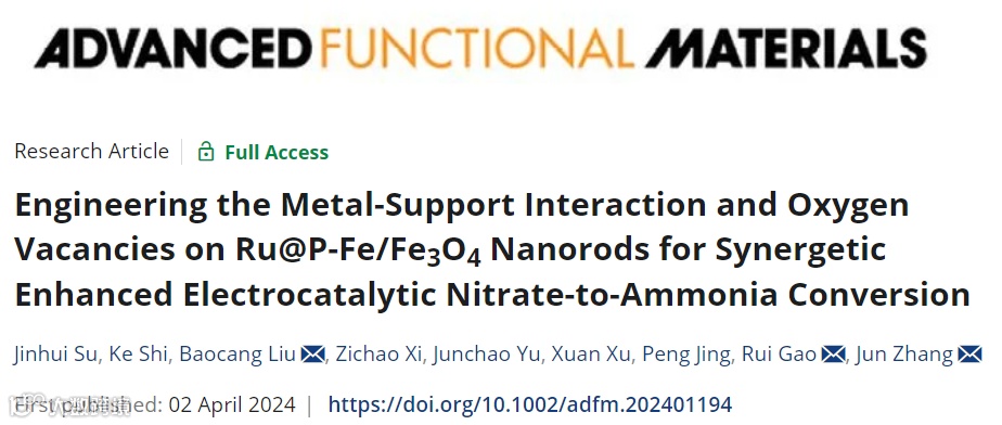 近日,内蒙古大学/内蒙古师范大学张军教授、内蒙古大学刘宝仓教授和内蒙古大学高瑞教授合作在国际知名期刊Advanced Functional Materials上发表题为“Engineering the Metal-Support Interaction and Oxygen Vacancies on Ru@P-Fe/Fe3O4Nanorods for Synergetic Enhanced Electrocatalytic Nitrate-to-Ammonia Conversion”的文章。该文章设计构建了一种高分散Ru纳米团簇负载的磷掺杂/磷酸盐修饰富氧空位Fe/Fe3O4纳米棒多组分复合电催化剂(Ru@P-Fe/Fe3O4),用于高效电催化NO3-RR合成NH3。