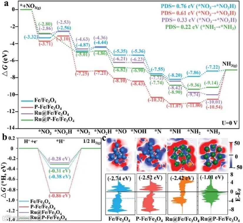 图6. Ru@P-Fe/Fe3O4催化剂上的NO3-RR机理研究.