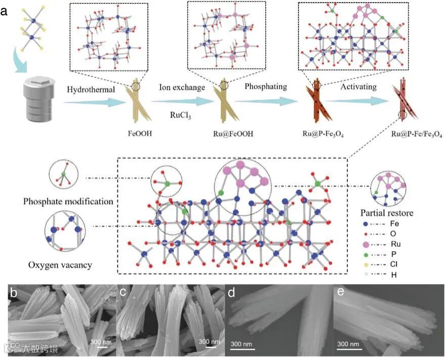 通过形貌、结构表征观察到所制备的P-Fe3O4纳米棒尺寸均匀,表面负载高度分散的小尺寸Ru纳米团簇(<1 nm)。经过电还原处理后,所得Ru@P-Fe/Fe3O4催化剂中Ru纳米团簇仍分散均匀,尺寸略有增加。其HRTEM图中出现Fe单质的晶格条纹,表明部分Fe3O被还原为单质Fe。由于Ru与Fe3O4之间的SMSI,还原后的Fe原子与Ru纳米团簇紧密接触,部分迁移到Ru团簇表面,从而阻止了Ru纳米团簇的迁移和团聚,增强了Ru@P-Fe/Fe3O4催化剂的稳定性。