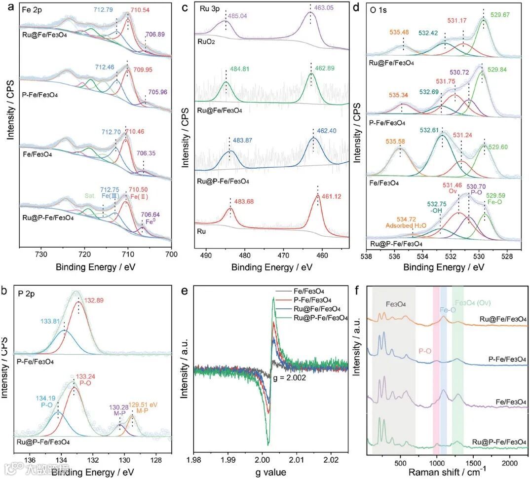 图3 Fe/Fe3O4, P-Fe/Fe3O4, Ru@Fe/Fe3O4和Ru@P-Fe/Fe3O4的高分辨XPS光谱图:(a) Fe 2p, (b) P 2p, (c) Ru 3p和(d) O 1s. (e) Fe/Fe3O4、P-Fe/Fe3O4、Ru@Fe/Fe3O4和Ru@P-Fe/Fe3O4的EPR谱图. (f) Ru@P-Fe/Fe3O4、Fe/Fe3O4、P-Fe/Fe3O4和Ru@Fe/Fe3O4的拉曼光谱.
