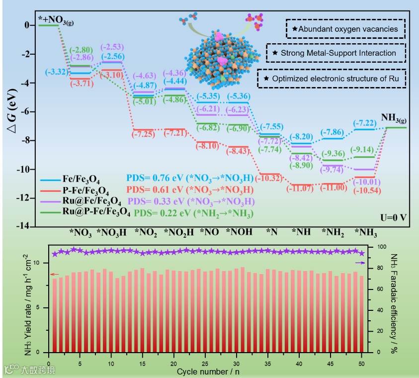 (1)P-Fe/Fe3O4表面高度分散的Ru纳米团簇保证了活性位点的充分暴露;(2)磷掺杂/磷酸盐修饰可诱导Fe/Fe3O4表面生成丰富的氧空位,这有利于反应物和中间体的吸附和活化;(3)金属-载体强相互作用(SMSI)不仅可调节Ru纳米团簇的电子结构,增强其本征活性,还可以促进Fe3O4的还原,在Ru纳米团簇周围形成Fe层,提高其催化稳定性;(4)Ru纳米团簇、磷掺杂Fe和磷酸盐修饰Fe3O4的电子耦合效应可以降低速率决定步骤(RDS)的反应能垒,抑制HER副反应,从而协同增强NO3-RR合成NH3性能。本研究证实了杂原子掺杂、氧空位构建和SMSI效应对Ru纳米团簇负载Fe3O4催化剂催化NO3-RR合成NH3的促进作用,为设计高效、稳定的金属负载型电催化剂提供了新思路。