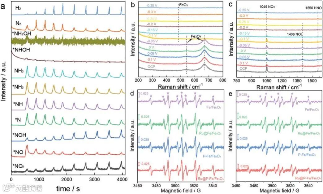图5.(a)Ru@P-Fe/Fe3O4催化剂电催化NO3-RR的在线电化学DEMS结果.(b,c)Ru@P-Fe/Fe3O4催化剂在0.1 M KNO3 + 0.5 M KOH介质中,不同波数范围的电化学原位Raman光谱.(d)Ru@P-Fe/Fe3O4, P-Fe/Fe3O4, Ru@Fe/Fe3O4, Fe/Fe3O4在0.5 M KOH中的原位EPR谱.(e)Ru@P-Fe/Fe3O4, P-Fe/Fe3O4, Ru@Fe/Fe3O4, Fe/Fe3O4在0.1 M KNO3 + 0.5 M KOH中的原位EPR谱.