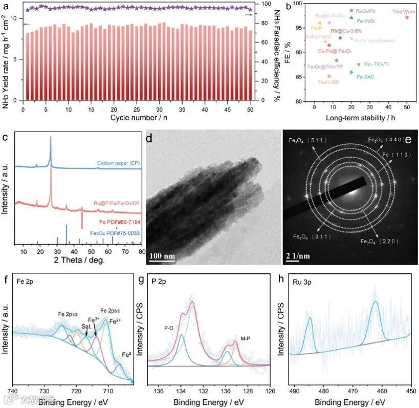 经过50次连续循环稳定性测试后,Ru@P-Fe/Fe3O4催化剂的NH3FE和产率基本保持不变,表明其具有较好的长期稳定性,其稳定性几乎优于所有已报道的Fe基和Ru基NO3−RR电催化剂。同时,稳定性测试后,Ru@P-Fe/Fe3O4催化剂的晶相、组成、结构、元素组成和价态均未发生明显改变,进一步证实了其具有优异的电化学稳定性。