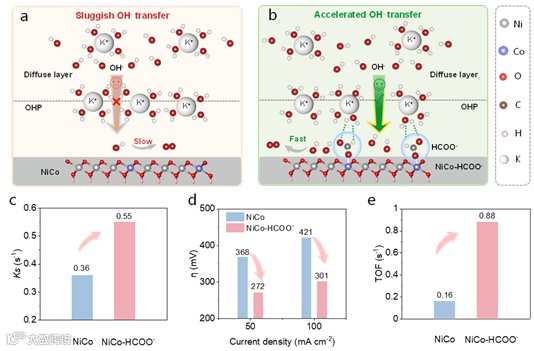图1 甲酸根修饰破坏水合层加快OH⁻传输