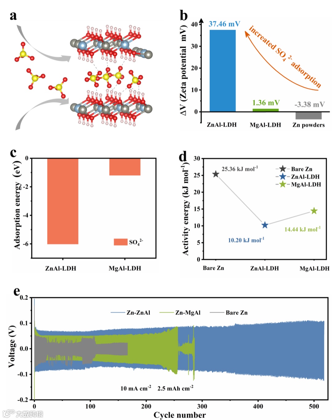 LDHs较大的层间距能够捕获大量的阴离子,成为优良的天然阴离子吸附剂。四种典型的LDHs材料(ZnAl-LDH、MgAl-LDH、ZnCr-LDH和CoFe-LDH)被用来构建“反阴离子耗尽层”。对称电池的性能与LDHs涂层对阴离子的吸附能力密切相关。ZnAl-LDH对SO42-阴离子优异的固定能力有效地提高了循环稳定性。