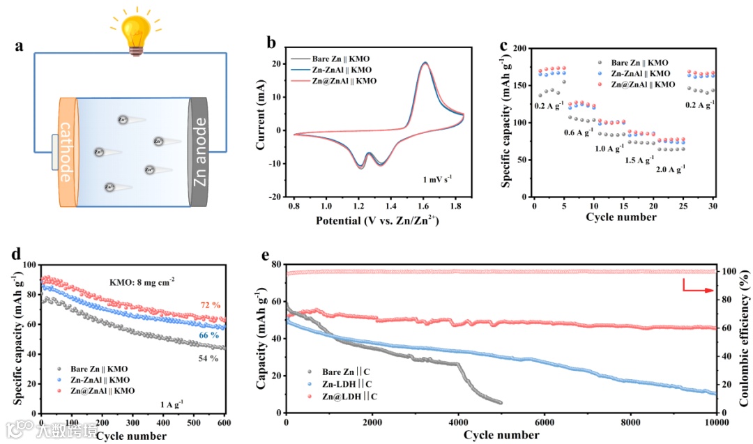 利用原位工程调节“反阴离子耗尽层”ZnAl-LDH纳米片的微观结构。取向一致的纳米片缩短了阳离子的扩散路径,均匀阳离子流,有利于阳离子快速均匀的沉积。同时有效避免了涂层的脱落,实现了在大电流密度下的稳定循环。