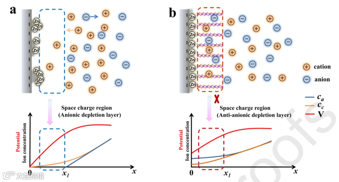 水系锌离子电池由于水系电解质固有的安全性、成本效益和金属锌的电化学平台,成为解决有机电池安全性问题的一个有效的方案。然而,锌金属阳极有限的寿命严重阻碍了水系锌离子电池的发展,这主要归因于枝晶问题和相关的副反应。为了从根本上解决枝晶生长的问题并制定有效的策略,深入了解其潜在机制至关重要。根据空间电荷理论,阴离子和阳离子在外加电场的驱动下向相反的方向迁移,导致阴离子和阳离子在阳极附近形成浓度梯度差。在电场的持续作用下,阳极表面的阳离子浓度可以从阴极得到补充,而阴离子会不断被耗尽,产生一个强大的空间电场。这放大了阳离子的尖端沉积效应,触发了枝晶的生长。因此,将阴离子锚定在阳极表面可以有效地阻止强空间电荷场的产生,从而抑制枝晶的产生。