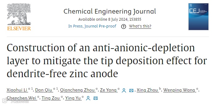 构建“反阴离子耗尽层”减缓尖端沉积效应助力无枝晶的锌阳极