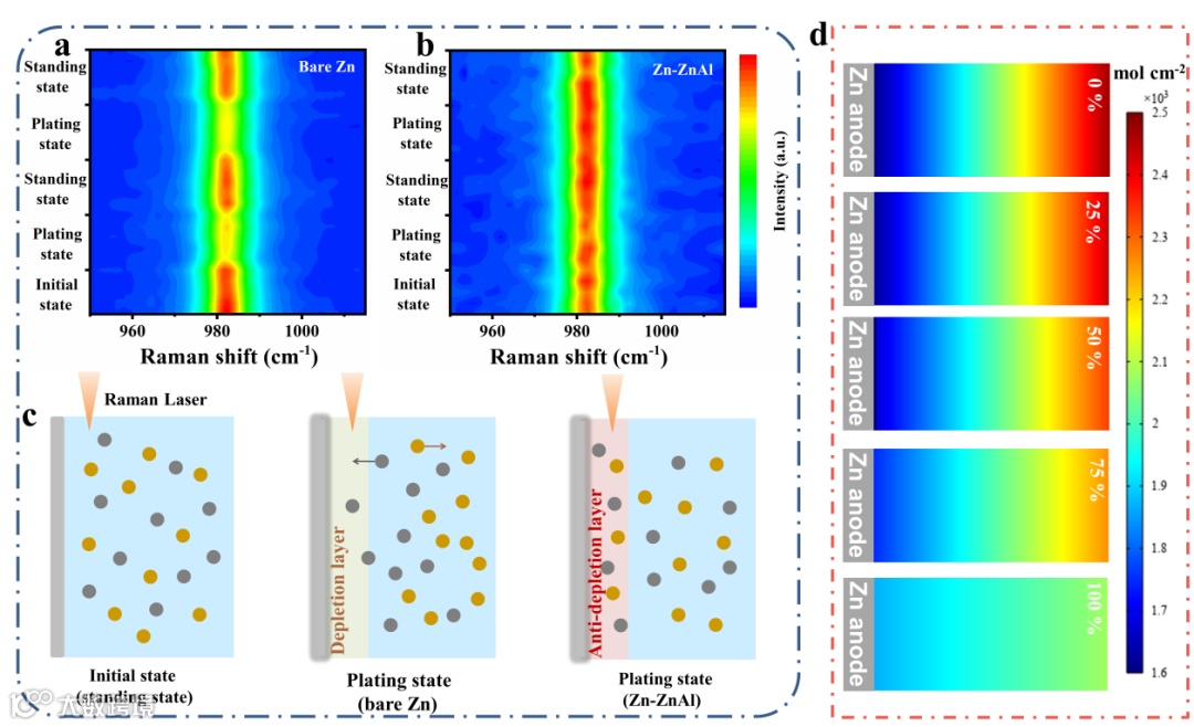 利用原位拉曼光谱对电镀过程中ZnAl-LDH修饰的Zn阳极表面SO42-阴离子浓度进行监测,发现ZnAl-LDH修饰后电极表面阴离子的浓度波动较小,有效地将SO42-固定在阳极表面,证明了“反阴离子耗尽层”的成功构建。此外,有限元模拟证实固定阴离子还可以调节阳离子流。