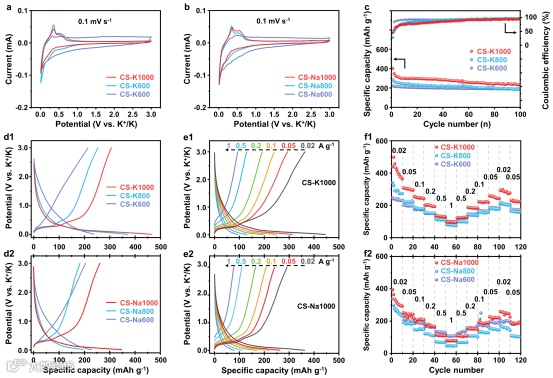 由图7所见,将其与普鲁士蓝(PB)配对组装成钾离子全电池(PB//CS-K1000)钾离子全电池器件。半电池中,PB在3.3-3.1 V电位处表现出放电平台,而钾离子全电池(PB//CS-K1000)在约3.0 V保持充放电平台。经过50 mA g-1电流密度循环15圈后,充放电容量为126.2 和115.8 mAh g-1,100圈充放电后容量仍然保持97.3 和95.2 mAh g-1。