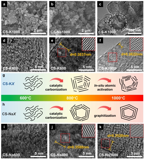 图1中TEM图像表明了石墨纳米炭的原位缺陷的演变过程,对比了含钾前驱体与含钠前驱体在炭化过程中的微观结构形貌。热解温度为600 ℃时,两种前驱体热解出的产物均表现为无序的非晶炭结构。随着温度不断升高,到800 °C含钠前驱体炭片层逐渐发育,形成有序的类石墨微晶结构。含钾前驱体中碳原子受到活化诱导,形成缺陷,表现为不规整的衍射晶格条纹。在1000 °C时含钠前驱体炭片层进一步发育,而含钾前驱体中原位活化作用加剧,进一步阻碍了炭片层的发育。