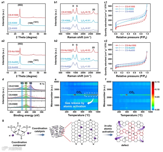 如图2所示,利用XRD、Raman、XPS、以及原位TG-IR联用测试结构进行分析,由于镍的催化碳化作用,NiCl2与乙二胺四乙酸二钾盐配位络合物的羧基官能团在约400℃的低热解温度下发生反应,释放CO2,同时沉积碳原子,有利于镍颗粒上类石墨层的生长。当温度升高到1000℃时,碳原子重新排列,形成具有边缘为、氮的有序石墨区。同时,热解诱导前驱体中的钾离子活化产生缺陷,从而获得具有缺陷结构的类石墨网络,这可以从CS-K1000原位红外光谱图上750℃至1000℃之间有CO2的集中释放得到证实。对两种不同前驱体、不同温度下制备的产物进行对比,可以提出结论,前驱体中钾离子的存在促进了类石墨纳米炭中缺陷结构的形成。