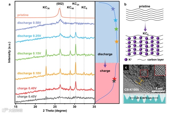 如图5,6所示,类石墨微晶炭的离子扩散动力学较快。非原位XRD测试分析表明,在充放电至不同低电位时,表现出钾-炭高阶化合物的特征峰,证明了在充放电过程中钾离子扩散至类石墨微晶处并发生嵌入反应,形成高阶化合物。而循环后HRTEM图像表明,该结构具有较好的稳定性,缓解了因钾离子嵌入引起的体积膨胀。