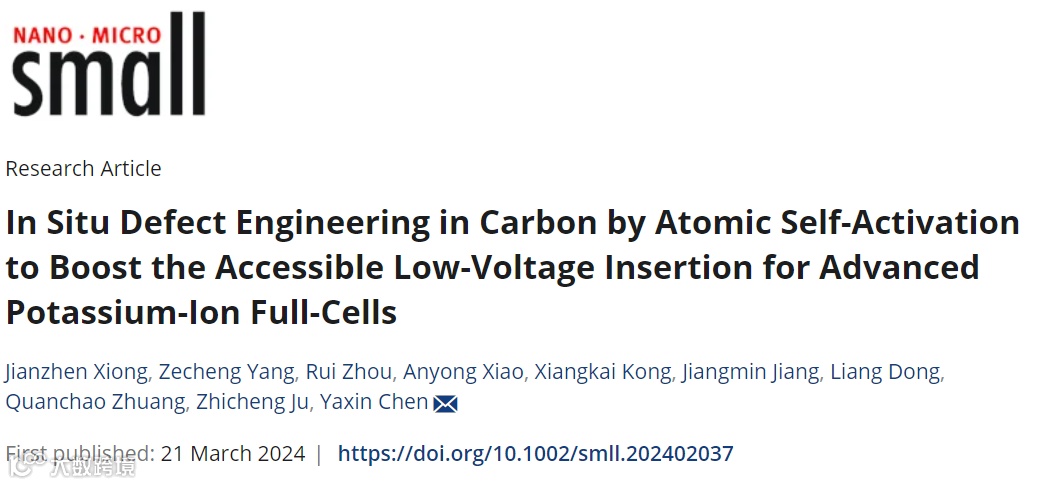 基于此,中国矿业大学陈亚鑫团队提出了一种基于原子自活化策略实现石墨纳米碳的原位缺陷工程,促进炭材料快速电化学储钾。相关成果“In-Situ Defect Engineering in Carbon by Atomic Self-Activation to Boost the Accessible Low-Voltage Insertion for Advanced Potassium-Ion Full-Cells“为题发表于国际知名期刊Small,并以Cover做亮点报道。中国矿业大学新能源材料与器件专业本科生熊坚桢为第一作者,陈亚鑫为通讯作者。
