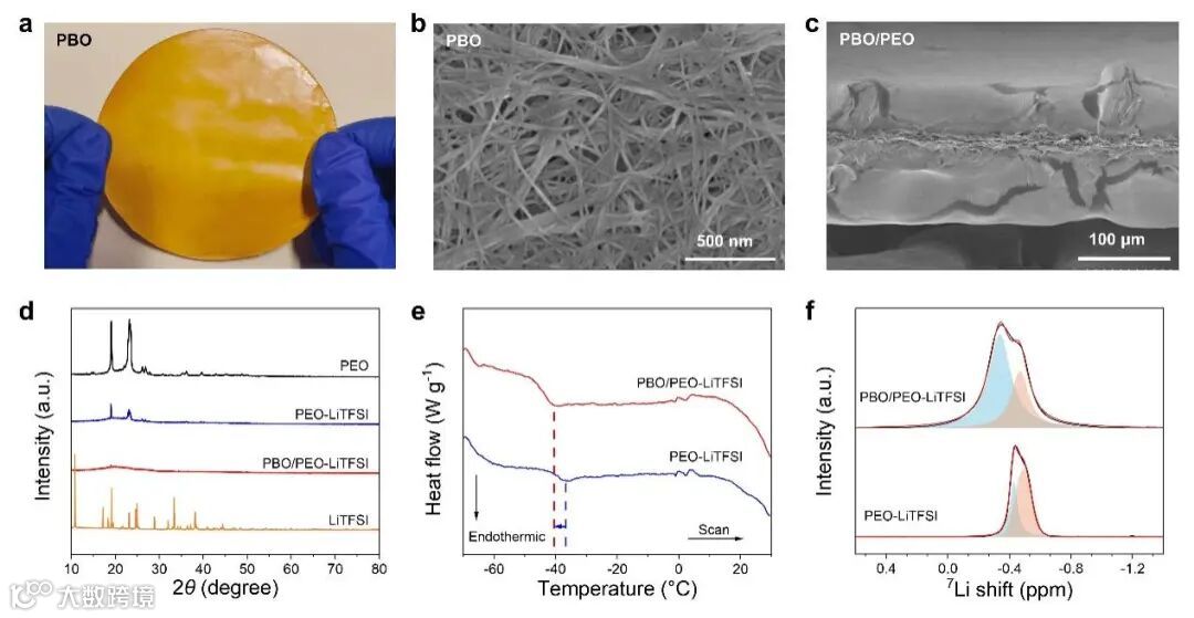 图2. PBO、PEO和PBO/PEO复合电解质的表征。a)PBO膜的照片;b)PBO的平面扫描电镜图像;c)PBO/PEO的截面扫描电镜图像;d)PBO/PEO和PEO电解质的XRD分析;e)PBO/PEO和PEO电解质的DSC曲线;f)PBO/PEO和PEO电解质的7Li-NMR光谱。