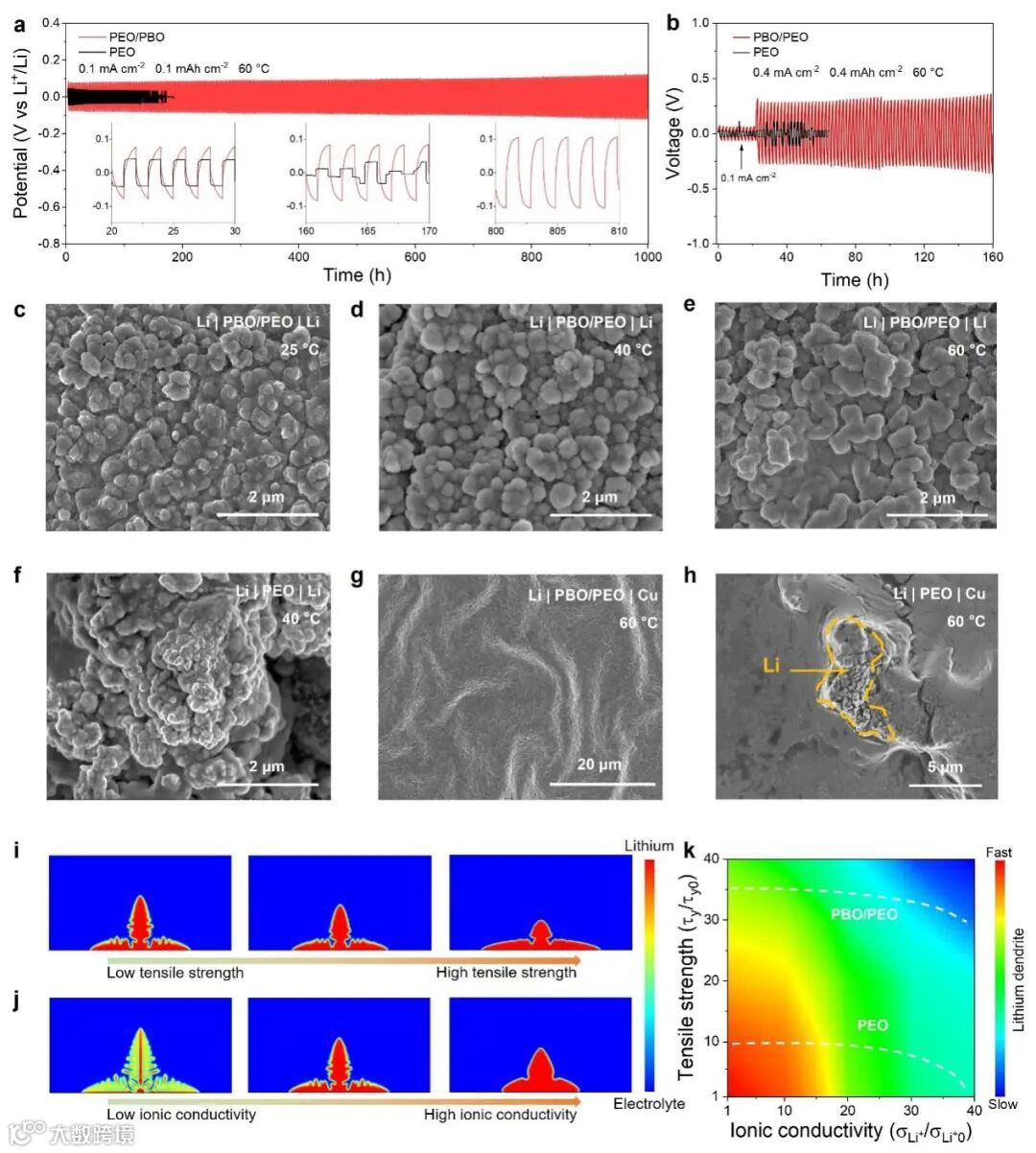 图4. 锂对称电池循环和锂沉积形态。使用PBO/PEO或PEO电解质的锂对称电池在60 °C下a)0.1 mA cm−2和0.1 mAh cm−2以及b)0.4 mA cm−2和0.4 mAh cm−2下的长期循环和放大的电压曲线。c)25 °C、d)40 °C和e)60 °C下Li | PBO/PEO | Li电池循环后锂片的SEM图像。f)40 °C下Li | PEO | Li电池中锂片的SEM图像。g)PBO/PEO电解质和h)PEO电解质60 °C下在Li | SPEs | Cu电池中沉积后的SEM图像。i)不同拉伸强度和j)不同离子导电率下的模拟锂枝晶形态演变的图像。k)离子导电率和拉伸强度共同影响下锂枝晶的生长和抑制图像。