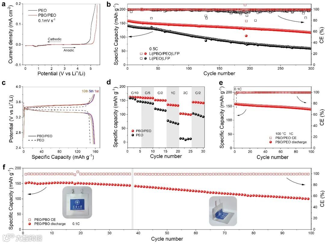 图5. 固态金属锂电池的全电池性能。a)PBO/PEO电解质和PEO电解质在0.1 mV s−1扫描速率下的LSV图。b)Li | PEO | LFP和Li | PBO/PEO | LFP电池在0.5C时的循环性能和库仑效率。c)0.5C下的充放电电压曲线。d)在C/10、C/2、C/5、1C和2C下的倍率性能。f)Li | PBO/PEO | LFP软包电池在0.1C下反复弯曲(约40次)前后的循环性能。