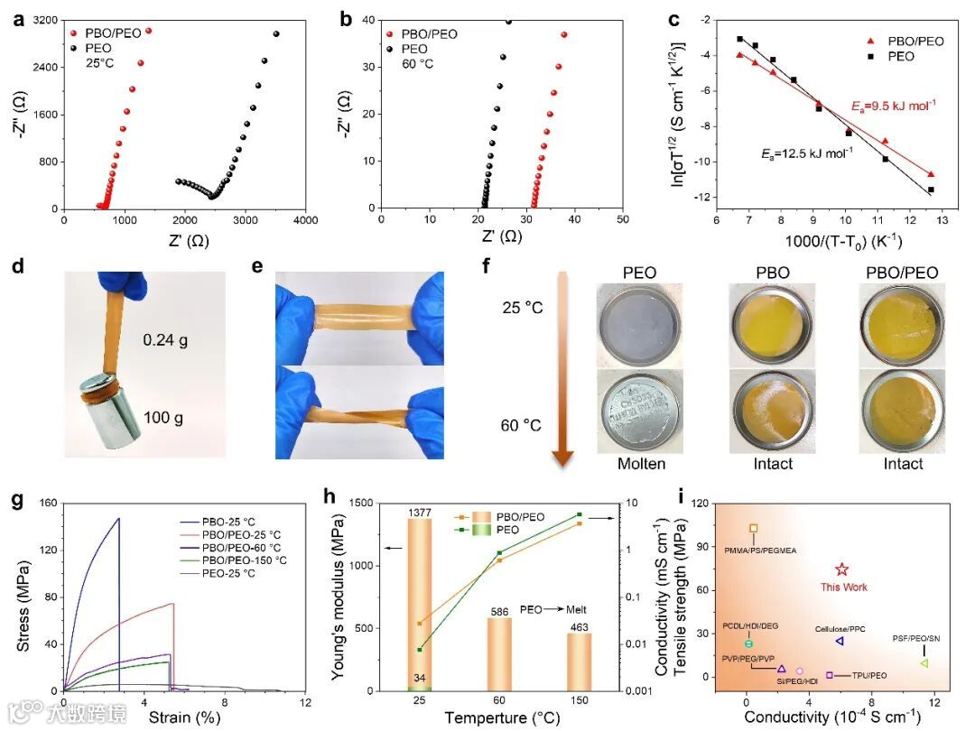图3. 不同温度下SPEs的离子电导率和机械性能。a)25 °C和b)60 °C时PBO/PEO和PEO电解质的奈奎斯特图。c)PBO/PEO和PEO电解质离子电导率的VTF拟合结果。d)PBO/PEO电解质膜拉动重量为100克砝码的照片。e)PBO/PEO电解质的高机械强度照片。f)PEO、PBO和PBO/PEO 电解质膜在 25 °C 和 60 °C 时的照片。g)PBO、PEO和PBO/PEO膜在不同温度下的应力-应变曲线。h)PBO/PEO和PEO电解质在25 ℃、60 ℃和150 ℃下的机械性能和离子导电率比较。i)PBO/PEO电解质的机械性能和离子电导率与近期文献报道的SPEs的相比较。