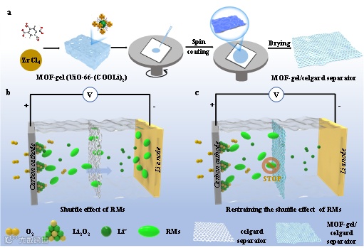 图1. a)旋涂法合成MOF凝胶及后续成膜工艺方案。b) celgard隔膜和c) MOF-gel/celgard复合隔膜抑制RMs穿梭的过程。