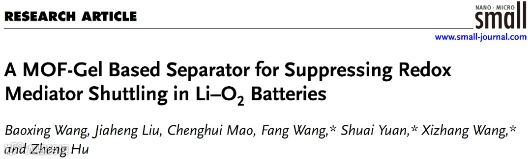 近日,来自南京大学的胡征教授、王喜章教授、袁帅教授和山东第一医科大学附属济宁市第一人民医院的王芳博士,在国际知名期刊Small上发表题为“A MOF-Gel Based Separator for Suppressing Redox Mediator Shuttling in Li–O2 Batteries”的研究论文,该论文的第一作者为济宁学院青年教师王保兴博士。该工作提出了一种金属-有机框架凝胶(MOF-gel)分离器来抑制RMs的穿梭。与传统的MOF纳米颗粒相比,MOF凝胶分离器成膜均匀致密、无宏观缺陷。当使用乙酰丙酮钌(Ru(acac)3)作为RMs时,MOF凝胶分离器可以有效抑制Ru(acac)3的穿梭效应,避免向锂阳极侧穿梭,显著提高了锂-氧电池性能(超长循环寿命(410次))。这一结果有望指导未来电池隔膜的发展和氧化还原介质的探索。