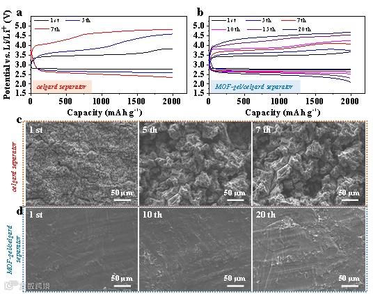 图5. a,b) 在1.0 A g−1电流密度时,使用celgard隔膜(a)和MOF-gel/celgard复合隔膜(b)的电池充放电曲线。可逆容量限制为2000mAh g−1。c,d) 用celgard隔膜(c)和MOF-gel/celgard复合隔膜(d)充电后的锂负极SEM图。