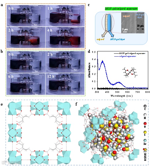 图3. a) Ru(acac)3 在Celgard 膜和b) MOF-gel/Celgard 复合隔膜的H 型电解池中的渗透实验。c) MOF-gel/celgard复合隔膜示意图。插图是MOF-gel/celgard复合隔膜的SEM截面图。d) H 型电解池右室中电解液的紫外-可见光谱图。e,f) UiO-66-(COOLi)2和封装在其孔内的DMSO结构理论模拟图。
