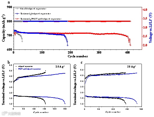 图4. 锂-氧电池中使用celgard隔膜和MOF-gel/celgard复合隔膜的终止电压与循环次数的关系。a) 电流密度: 0.5 A g−1,截至容量: 800 mAh g−1。b) 电流密度: 1.0 A g−1,截至容量:500 mAh g−1。c) 电流密度: 2.0 A g−1,截至容量: 800 mAh g−1。