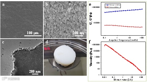 图2. MOF凝胶的形貌和流变性能。a,b)低、高倍率的SEM图像。c) TEM图像。d)照片。e)振荡频率扫描流变测量和f)粘度对剪切速率图。