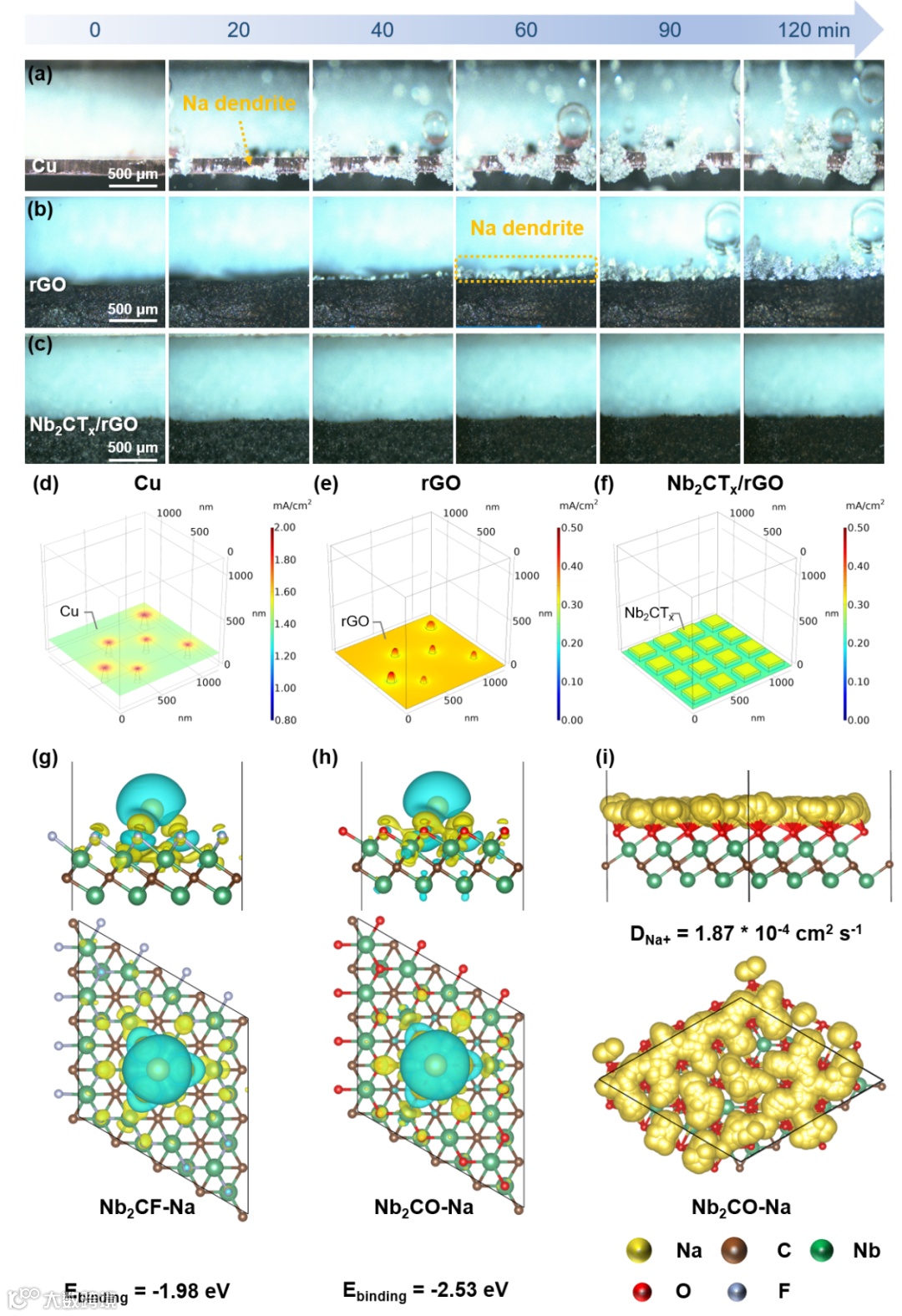 图4.(a)Cu,(b)3DP rGO和(c)3DP Nb2CTx/rGO电极在3.0 mA cm-2的电流密度下沉积120 min的原位光学显微镜图像。(d)Cu、(e)3DP rGO和(f)3DP Nb2CTx/rGO电极表面电流密度分布。DFT计算(g)Nb2CF和(h)Nb2CO与Na之间的结合能。(i)AIMD模拟得到钠金属在Nb2CO上沉积动力学。