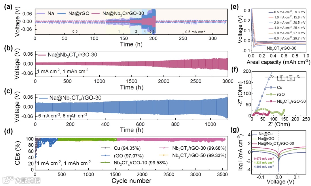 图3. 3DP Nb2CTx/rGO微网格气凝胶电极的电化学性能。(a)Na、3DP Na@rGO和Na@Nb2CTx/rGO-30对称电池在不同电流密度下的倍率性能。Na@Nb2CTx/rGO-30对称电池在(b)1 mA cm-2和1 mAh cm-2和(c)6 mA cm-2和6 mAh cm-2时的循环性能。(d)在1.0 mA cm-2,1.0 mAh cm-2条件下,Cu、3DP rGO和Nb2CTx/rGO-10、30、50电极的CEs。(e)基于半电池的3DP Nb2CTx/rGO-30电极在不同电流密度下的电压分布图。(f)Cu、3DP rGO和Nb2CTx/rGO-30电极在30个循环后的EIS曲线。(g)Na@Cu、Na@rGO和Na@Nb2CTx/rGO-30电极的Tafel曲线。