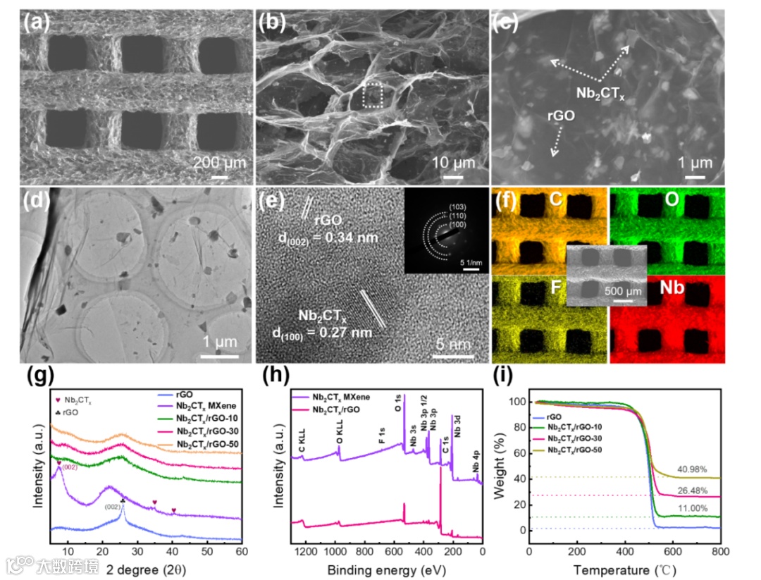 图2. 3DP Nb2CTx/rGO电极的表征。(a-c)3DP Nb2CTx/rGO-30微网格气凝胶的扫描电镜图像。(d)TEM和(e)Nb2CTx/rGO-30的HRTEM图像。(e)中的是相关的选择区域电子衍射(SAED)图像。(f)3DP Nb2CTx/rGO-30微网格气凝胶的SEM图像对应的EDS图像。(g)Nb2CTxMXene、3DP rGO和Nb2CTx/rGO纳米复合材料的XRD谱图。(h)Nb2CTxMXene和Nb2CTx/rGO纳米复合材料的XPS谱图。(i)3DP rGO和Nb2CTx/rGO纳米复合材料的TGA曲线。