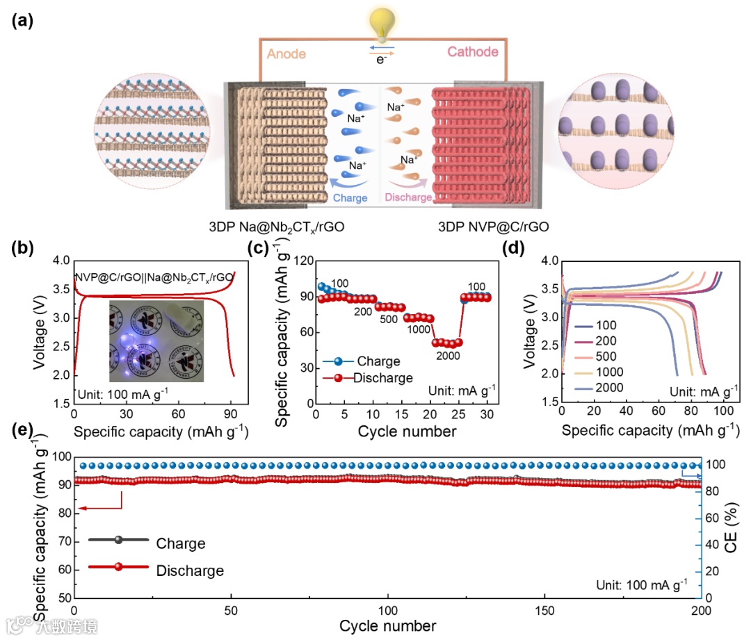 图6. 3DP NVP@C/rGO||Na@Nb2CTx/rGO全电池电化学性能评估。(a)全电池示意图;(b)100 mA g-1下的GCD曲线,插图中组装的电池点亮了LED灯串。(c)100-2000 mA g-1下的倍率性能以及(d)相关GCD曲线。(e)在100 mA g-1下的循环性能和相应的CE。