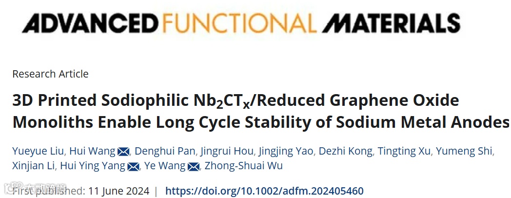 Yueyue Liu, Hui Wang,* Denghui Pan, Jingrui Hou, Jingjing Yao, Dezhi Kong, Tingting Xu, Yumeng Shi, Xinjian Li, Hui Ying Yang,* Ye Wang,* Zhong-Shuai Wu ‘3D Printed Sodiophilic Nb2CTx/Reduced Graphene Oxide Monoliths Enable Long Cycle Stability of Sodium Metal Anodes’, Adv. Funct. Mater. 2024, 2405460.