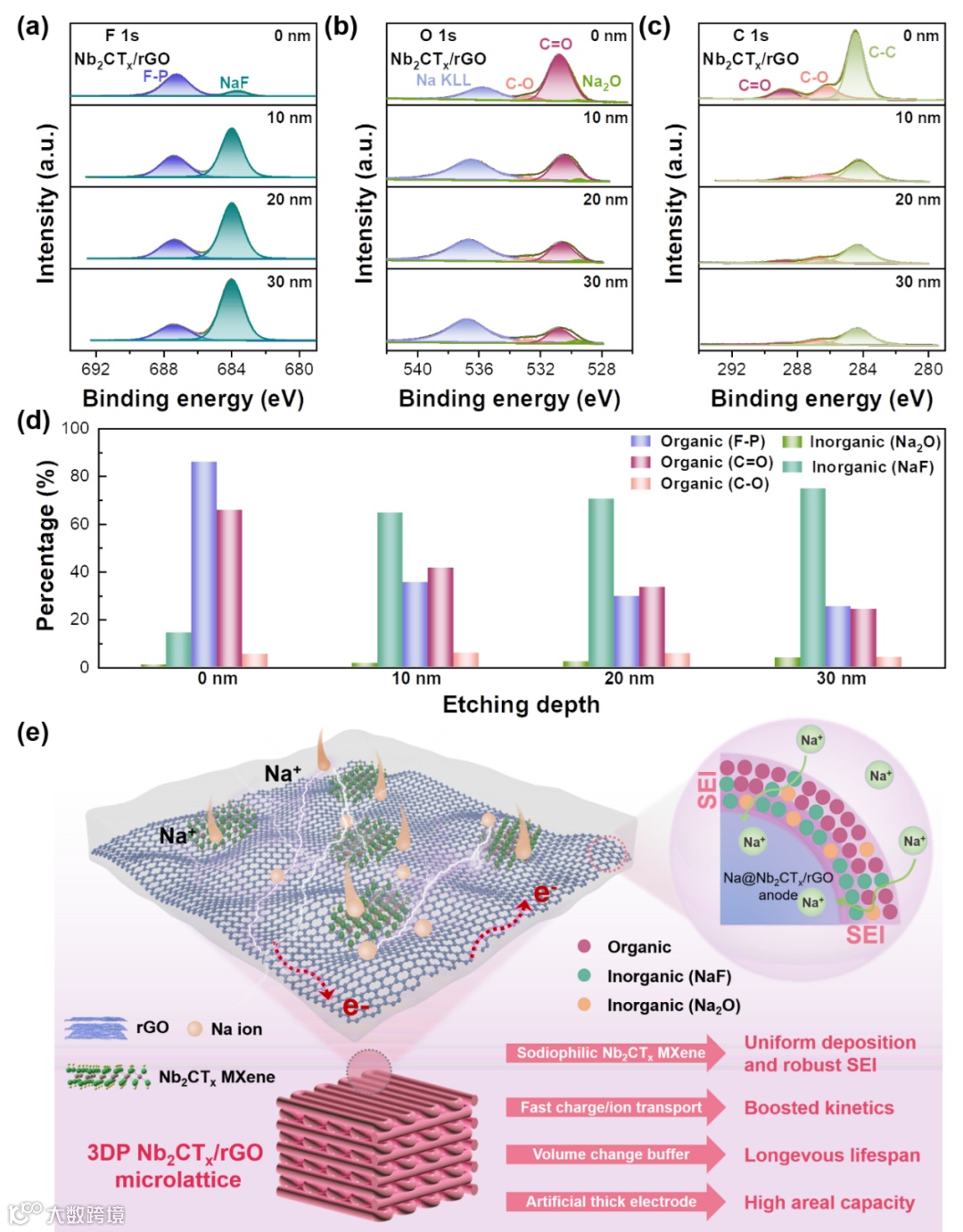 图5. Na@3DP Nb2CTx/rGO负极SEI膜的化学性质。(a)F 1s,(b)O 1s和(c)C 1s在1.0 mA cm-2和1.0 mAh cm-2下循环20次后的深度刻蚀XPS谱图。(d)不同深度的SEI膜有机与无机物的含量比较。(e)具有分层多孔结构的3DP Nb2CTx/rGO微网格电极的示意图。