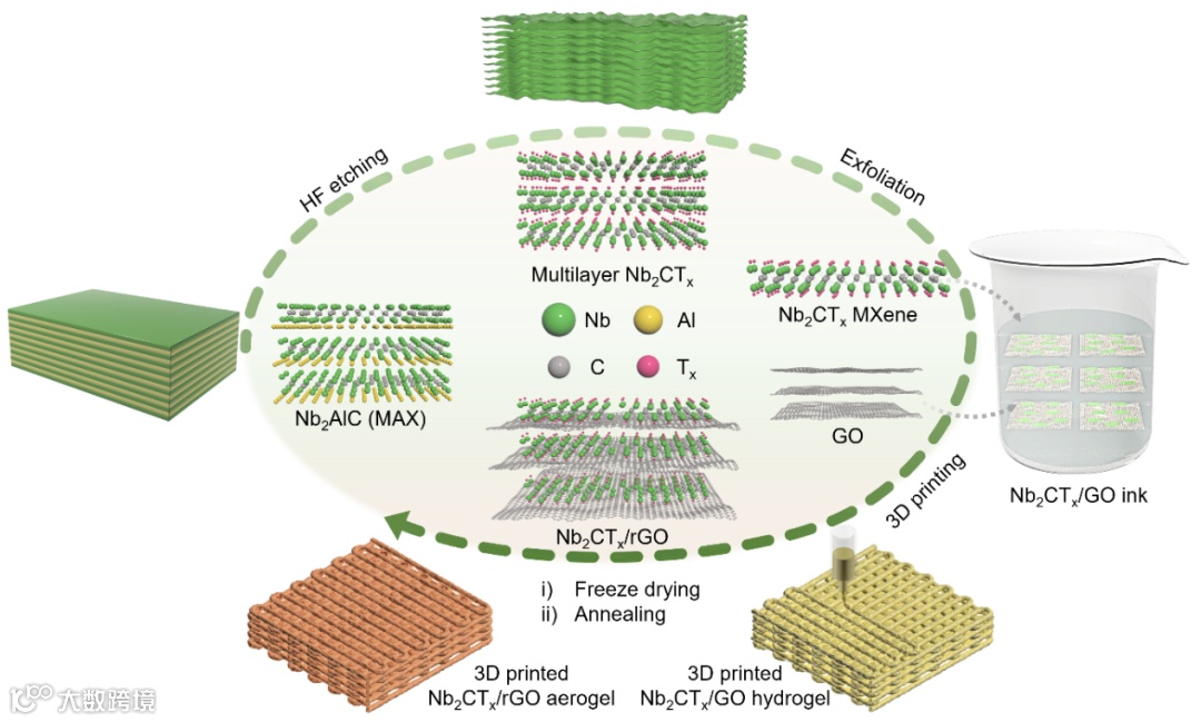 图1. 3DP Nb2CTx/rGO微网格气凝胶电极的制备工艺示意图。
