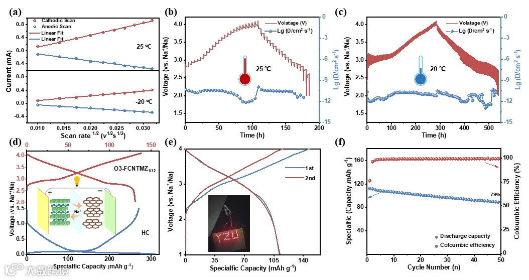 在25 ℃和- 20 ℃下,通过循环伏安法和恒电流间歇滴定技术测量Na+的扩散系数来表征FCNTMZ1/12正极材料的动力学性能。计算得到的DNa+值从25 ℃时的10-11 cm2 s-1降低到-20 ℃时的10-12 cm2 s-1。NFCMTZ1/12正极的高熵结构不仅保持了O3相的稳定性,而且最大限度地减少了Na+脱出/嵌入过程中的O3-P3结构转变,从而促进了更有效的Na+传输。为进一步探究其应用前景,以FCNTMZ1/12为正极,硬碳为负极构建全电池。在30 mA g-1的电流密度下,全电池提供约112 mAh g-1的容量,循环50次后仍保留其初始放电容量的79%。这些优异的电化学性能进一步验证了O3-FCNTMZ1/12作为钠离子电池正极材料的潜力。