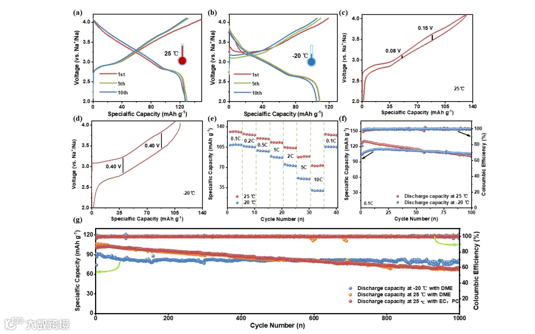 在25 ℃下,FCNTMZ1/12正极的可逆比容量为127.3 m Ah g-1,首次库伦效率约为83.0 %。-20 ℃时,FCNTMZ1/12正极在0.1 C下仍能提供109.6 mAh g-1的容量,约为其在25 ℃时容量的86.1%。FCNTMZ1/12正极在25 ℃和-20 ℃下0.1C经过100次循环后分别能保持其容量的80%和92%。即使在5C的大电流倍率下,FCNTMZ1/12正极在25 °C下1000次循环后,容量保持为69%。在-20 ℃下, 1C 循环600和1000次后分别保持初始容量的90.2%和87.8%,表明其在低温下具有优异的稳定性。
