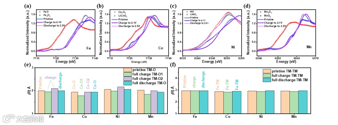 为了研究FCNTMZ1/12正极中活性元素的电荷补偿,分别在原始态、完全充电( 4.1 V )和完全放电( 2.0 V )状态下进行了非原位XAS测量。在首次充电/放电过程中,Ni2+/Ni4+,Fe3+/ Fe3.6+和Co3+/Co3.6+氧化还原电对的总可逆容量为127 mAh g-1。此时,P3结构中TM-O1和TM-O2键的长度分别减少了约2.5-9.9 %和0.5-5.4 %。同时,TM - TM距离减少约0.3 - 2.1 %。与TM - O2距离相比,TM-O1距离的减小更为显著,表明P3结构中O1引起了强烈的应力变化。此外,即使没有活性的Mn4+在Mn-O和Mn-TM键中也会发生收缩,这表明它参与了整体结构的重排。在放电到2.0 V,P3结构恢复为O3结构,TM-O和TM-TM键之间的距离恢复到原来的长度。这与原位XRD观察到的可逆结构转变和较小体积变化是一致的。所选阳离子的尺寸差异小于15 %,容易导致TM-O和TM-TM键长变化减小,进而增强短程局域环境下的结构稳定性。