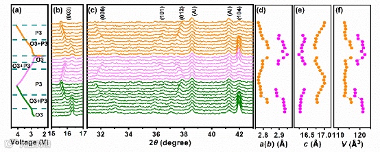 为了详细研究结构演变,在0.1C倍率下进行了原位XRD实验。充电时O3相的(003)和(006)峰向较低角度移动,O3相的强度减小,在15.8°处出现一个新的峰值,表明P3相的出现。在3.6 V时,初始的O3相衍射峰完全消失,P3相占主导地位。在第一次放电中,结构演变与第一次充电相反。晶格参数a(b)和c的恢复到初始状态,表明FCNTMZ1/12结构转变是高度可逆的。在第二次充电中,结构变化与首次充电时观察到的完全一致。在整个充放电过程中都没有涉及到O3'、O3"和P'3相恶化结构的可逆性,影响循环稳定性。钠离子嵌入/脱出前后的晶胞体积变化仅为3%,确保了出色的电化学性能。