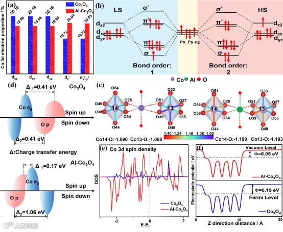 为了阐明这些电化学性能增强的来源,我们采用密度泛函理论(DFT)计算,提供了微观的见解,解释了打开自旋向上和自旋向下通道如何影响Al-Co3O4的电子和晶体结构。通过计算键序、COHP等结果,我们强有力地验证了增强的结构稳定性;同时,通过自旋密度计算、功函数以及计算扩散能垒等验证了动力学的增强机制。