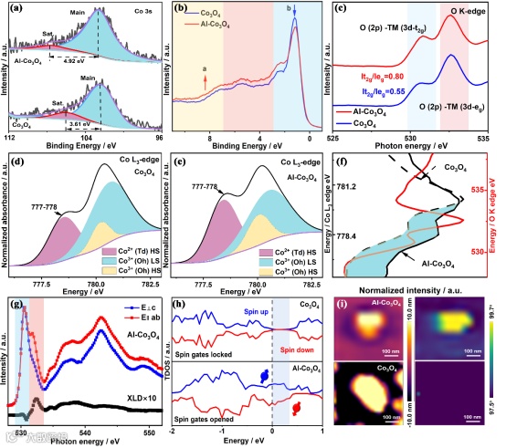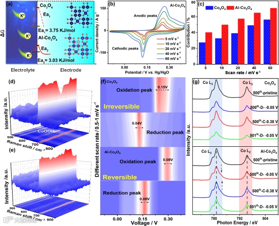 一系列的电化学实验及多温度阻抗结果表明,具有解锁上下自旋门构型的Al-Co3O4具有更高的比容量以及更优异的动力学性能。通过结合原位拉曼测试,原位CV测试以及类原位sXAS等测试,我们深入探究了其结构演化,并对其稳定性进行了评估。结果表明,Al-Co3O4中自旋向上和自旋向下通道的战略性开放在优化电荷转移动力学和增强结构稳定性方面具有双重优势,从而展示了TMOs在先进储能应用中的潜力。