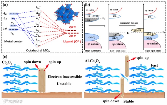 电化学储能中的电荷转移过程与材料的电子构型紧密相关,特别是涉及自旋相关的电荷转移和轨道相互作用。在考虑到晶格和自旋有序之间相互作用的基础上,我们可以通过调整表面晶格环境来调节电子组态,从而对电荷转移动力学产生影响。具体而言,我们分析了八面体MO6配合物的分子轨道能图以及能量分裂和电子结构转换示意图(见图1a、b)。借助以上理论指导,我们设计了如图1c所示的“自旋门”开启前后的工作比较机制示意图,通过巧妙地操纵上下自旋门来增强结构稳定性和反应性。