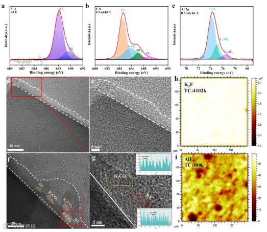 通过对在不同电解液中循环的硬碳的XPS以及TEM表征,证明了KF的产生,说明添加剂的引入成功促进了SEI层中KF的产生,同时ToF-SIMS的测试结果也说明了含氟的SEI成分同样包括AlF3。