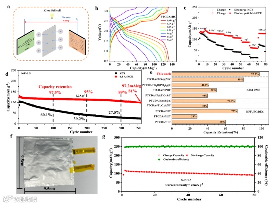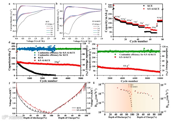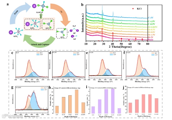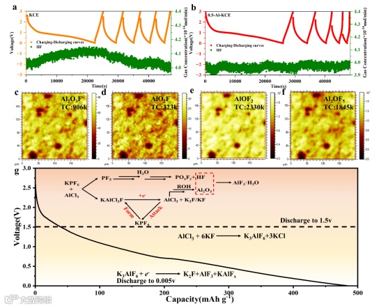 通过对循环后的极片以及电解液进行测试和模拟,发现AlCl3的具体作用机制如下:首先当AlCl3加入KPF6EC/DEC电解液中后,由于Al3+高离子电荷数/离子半径的特性,使得AlCl3的基团可以从PF6-处夺取氟原子,形成AlCl3F-的全新基团,这种基团具有很高的反应活性,会在之后的电化学过程中通过一系列反应转化为KF,其次反应过程中生成的Al2O3会和反应的副产物HF反应生成AlF3,从而达到对反应副产物的清除作用。这种“自诱导作用”形成的富氟SEI层(KxF和AlF3)以及对反应过程副产物(HF和H2O)的“自清除作用”保证了钾离子电池出色的循环稳定性。