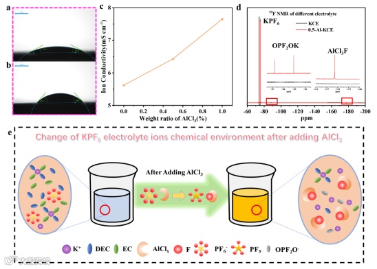 本研究发现在KPF6EC/DEC电解液中加入AlCl3后,电解液的化学环境会出现显著变化,电解液的电导率会增加。通过测试发现,电解液中出现了AlCl3F-的阴离子基团,表明含铝的基团会从PF6-离子上夺取F原子,形成新的活性含氟基团。