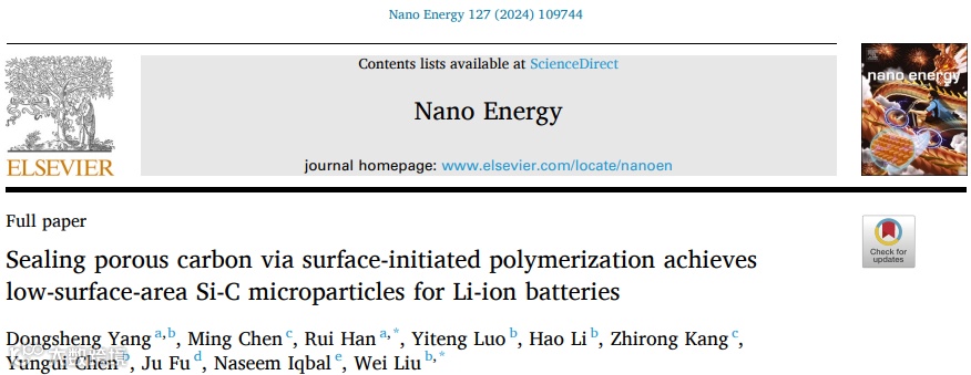 Sealing porous carbon via surface-initiated polymerization achieves low-surface-area Si-C microparticles for Li-ion batteries, Dongsheng Yang, Ming Chen, Rui Han*, Yiteng Luo, Hao Li, Zhirong Kang, Yungui Chen, Ju Fu, Naseem Iqbal, Wei Liu*