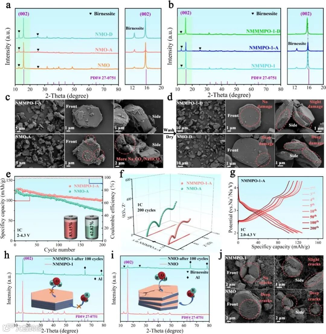 图5. (a) NMO、NMO-A和NMO-D的XRD图谱和放大的(002)晶面;(b) NMMPO-1、NMMPO-1-A和NMMPO-1-D的XRD图谱和放大的(002)晶面;(c) NMO-A和NMMPO-1-A的SEM图像,以及片状颗粒正面和侧面的SEM图像;(d) NMO-D和NMMPO-1-D的SEM图像,以及片状颗粒正面和侧面的SEM图像;(e) NMO-A和NMMPO-1-A阴极在0.5C时的循环性能和库仑效率;(f)在1C循环200次后,NMMPO-1-A和NMO-A阴极的EIS测量结果;(g) 0.5C时NMMPO-1-A阴极充放电曲线;NMMPO-1 (h)和NMO (i)阴极在0.5C下循环100次后和循环前的XRD图谱,以及层间水分子插入示意图;(j)在0.5C下循环100次后,NMMPO-1和NMO阴极上片状颗粒正面和侧面的SEM图像。