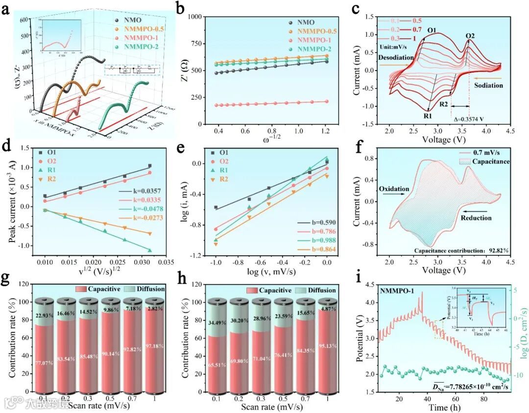 图3. 电极动力学分析。(a) 在NMMPO-x阴极的EIS测量,插图中显示了相应的等效电路;(b) 对Z’与ω−1/2数据进行线性分析;(c) NMMPO-1阴极在0.1至1 mV s−1的扫描速率下获得的CV曲线;(d) NMMPO-1阴极的峰值电流和扫描速率平方根之间的关系;(e) NMMPO-1阴极中观察到的氧化还原峰的电流和电压之间的对数相关性;(f) NMMPO-1阴极在0.7 mV s−1的扫描速率下电容对总电流的贡献,如图中蓝粉色区域所示;NMMPO-1(g)和NMO(h)阴极在不同扫描速率下的电容控制和扩散控制钠存储机制的百分比表示;(i) NMMPO-1阴极在0.1C下的GITT曲线。