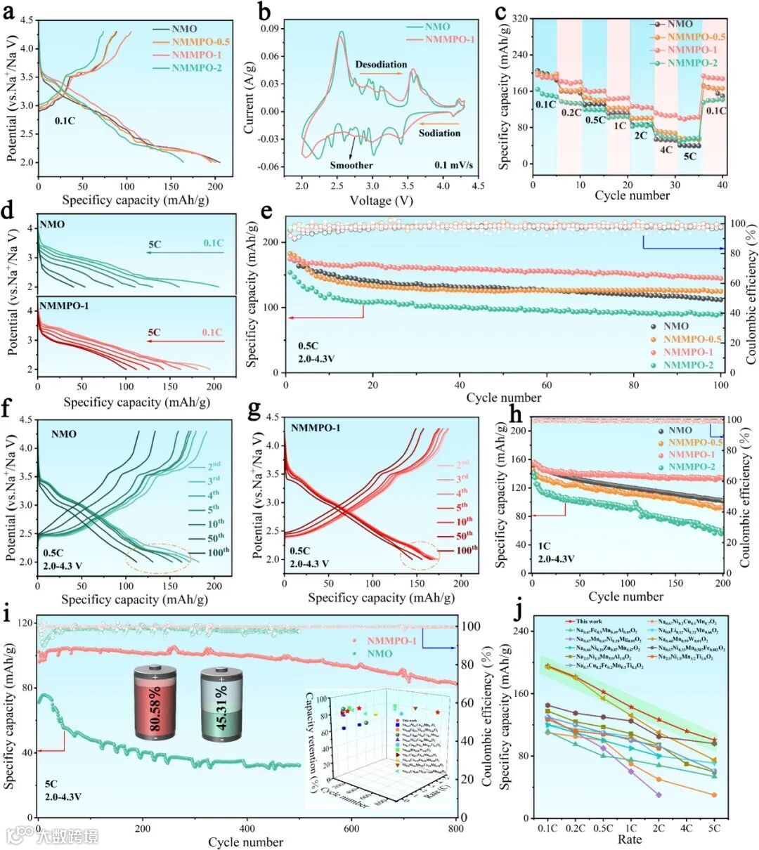 图2. (a) NMMPO-x阴极在0.1C的初始电化学循环期间的充电和放电曲线;(b) NMO和NMMPO-1阴极的CV曲线;(c) NMMPO-x阴极的倍率性能;(d) NMO和NMMPO-1阴极在不同速率下的放电曲线;(e) NMMPO-x阴极在0.5C下的循环性能和库仑效率;NMO(f)和NMMPO-1(g)阴极在0.5C下的100次循环充放电曲线;(h) NMMPO-x阴极在1C下的循环性能;(i) NMMPO-1和NMO阴极在5C下的循环性能;(j) 本研究中材料与已报道材料的速率性能比较。