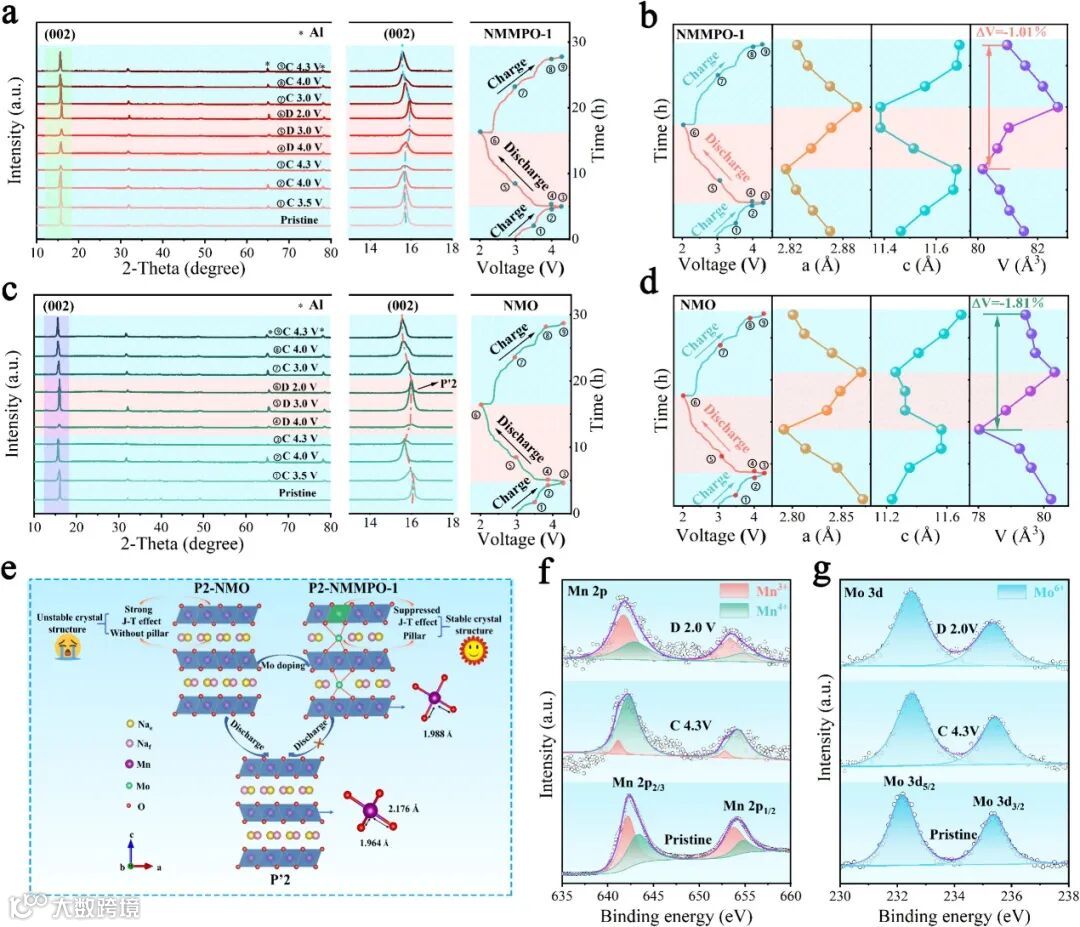 图4. NMMPO-1(a)和NMO(c)阴极在第一次充电/放电和第二次充电循环期间的非原位XRD图谱、(002)晶面放大和电压-时间图;NMMPO-1(b)和NMO(d)阴极的P2相在充电和放电过程中的晶格参数a、c和体积V的变化;(e) NMO和NMMPO-1的晶相演化示意图;NMMPO-1阴极的Mn2p(f)和Mo3d(g)的非原位XPS光谱。